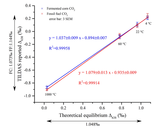 科研人員開發(fā)了一種使用可調(diào)諧紅外激光差分吸收光譜(TILDAS)的方法,能夠快速、高精度地測(cè)量二氧化碳中的團(tuán)簇同位素組成(Δ???),研究者使用兩個(gè)紅外激光器,分別在 2250.2 cm?1 和 2285.1 cm?1 波段,同時(shí)直接測(cè)量四種關(guān)鍵CO?同位素分子(626、636、628、638)的吸收光譜,從根本上避免了質(zhì)譜法中的同質(zhì)異位素干擾。實(shí)時(shí)分析吸收峰面積,通過計(jì)算 ([628]/[626])與([638]/[636])的比值來推導(dǎo)反應(yīng)平衡常數(shù)K,并最終轉(zhuǎn)化為相對(duì)于工作參考?xì)獾摩???值。