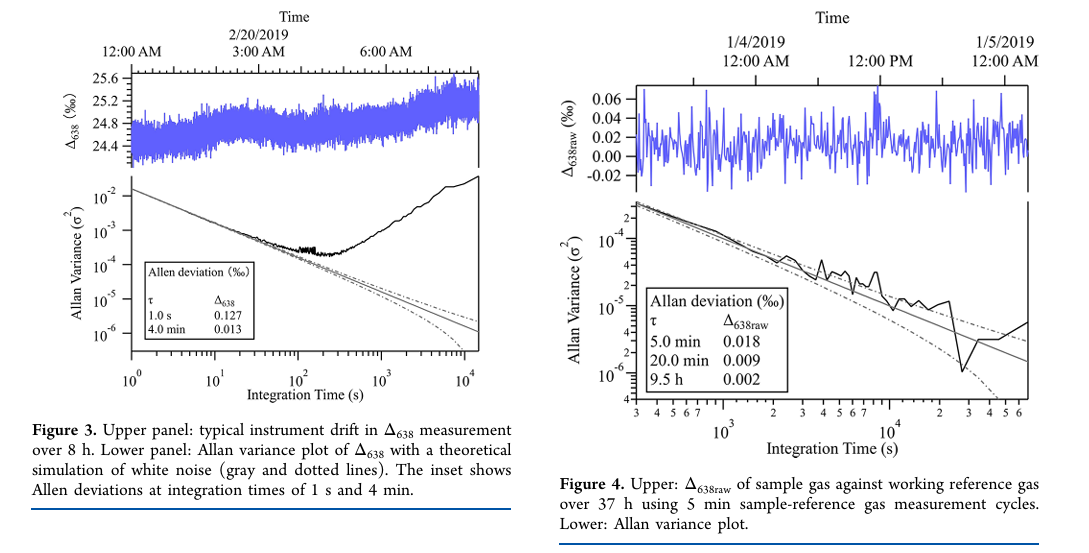 上述研究中使用到的設(shè)備為TILDAS雙激光團(tuán)簇同位素測(cè)量系統(tǒng),使用 36 米光程的多通池,體積約為 250 mL,配合高靈敏度 HgCdTe 探測(cè)器,采用自動(dòng)化氣體進(jìn)樣系統(tǒng),包括電子閥、氣動(dòng)閥、臨界孔和壓力傳感器,確保氣體引入過程中無同位素分餾,利用 TDLWintel 軟件實(shí)時(shí)分析吸收光譜,計(jì)算各同位素的峰面積比,進(jìn)而推導(dǎo)出 Δ??? 值。